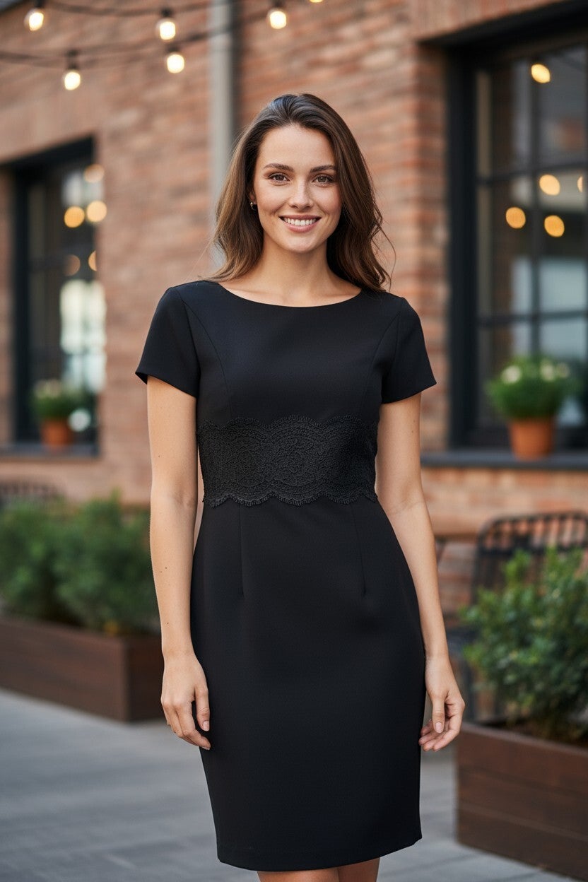 Dit is een zeer mooie en elegante zwarte jurk. Het model heeft een kort mouwtje en sluit aan de achterkant met een lange rits. De strook kant op de jurk geeft het een chique uitstraling.